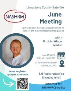Join the Limestone County Satellite of NASHRM for their June Meeting on June 18th at 11:30 am. Dr. John Wilson will share insights on connecting and maximizing local talent pipelines. Registration is $25 and includes lunch. Attendees must register by 5 PM on June 16th. This event is submitted for SHRM/HRCI credit. Secure your seat here.