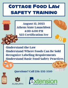 This course meets ADPH requirement to operate as a Cottage Food Operation. You will learn specifics about the Law, allowed foods to sell, how foods can be sold, labeling requirements, food safety recommendations, and basic food processing for allowed products. There is a $25, non-refundable fee that will cover the cost of your certification. Secure your seat now!
